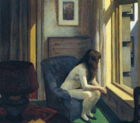 Durante el día se sienta al desnudo en su sillón favorito, un sillón lleno de cortes, donde
